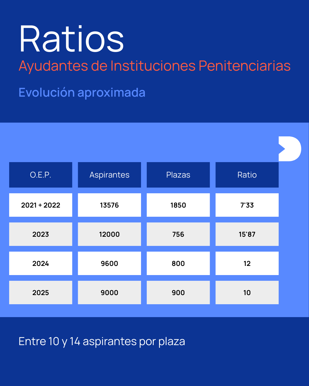 - Convocatoria anual: se convocan cada año, siendo el número de plazas elevado y un ratio de aspirantes por plaza relativamente bajo. Esto nos indica que no es un proceso masificado, lo cual siempre es bueno para el opositor.