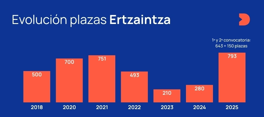 La evolución de plazas convocadas por la Ertzaintza es muy favorable, convirtiéndose en una oposición anual con más de 500 plazas habitualmente: